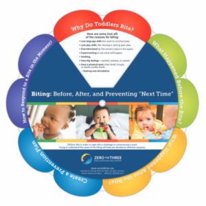 Caregivers need easy-to-use and practical resources to feel empowered in their crucial roles with their little ones. Our Behavior Has Meaning Wheels have been helping caergivers and child care providers learn to manage challenging behavior effectively for more than a decade. Covered behaviors include biting, tantrums, inconsolable crying, separation anxiety, and social withdrawal. This bestselling ZERO TO THREE exclusive comes in packages of 10 bilingual (English and Spanish) wheels designed for professionals to share with parents and caregivers.Biting: Before, After, and Preventing Next Time Wheels